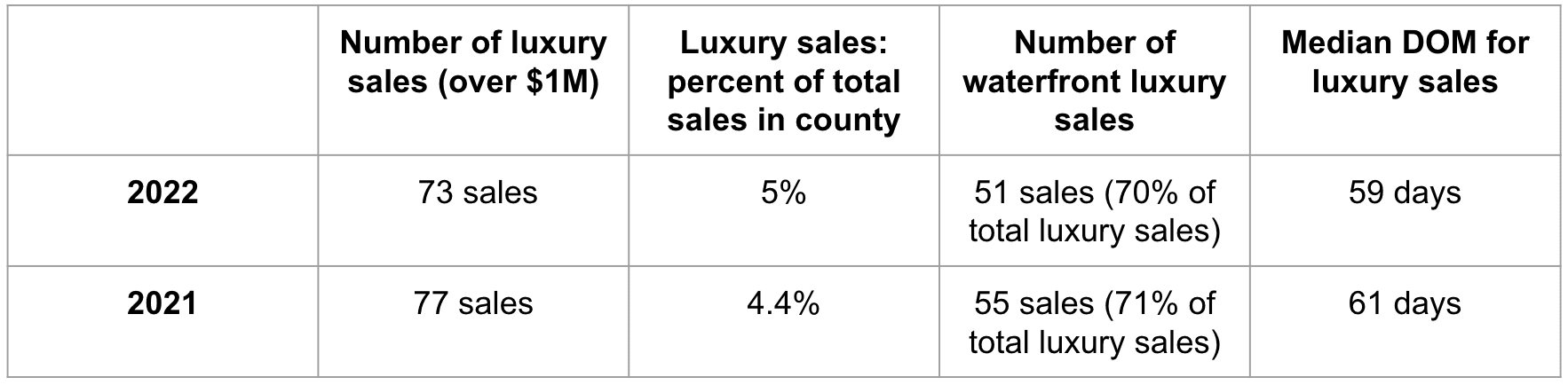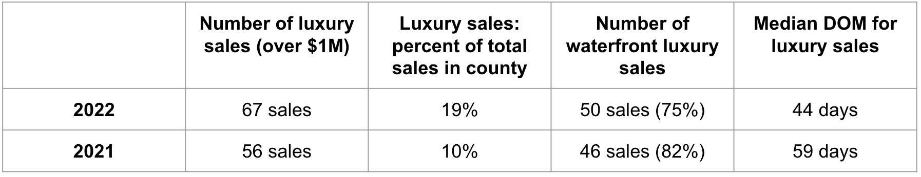 Luxury sales accounted for 5% of total market share in Grand Traverse in 2022, up from 4.4% in 2021. A majority of luxury sales were waterfront properties (70%) and the average days-on-market for luxury properties was just 59 days.