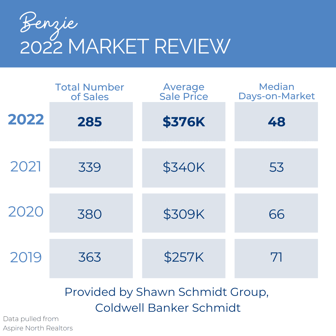 The same story. The number of sales dropped from 2021 to 2022, while the average sale price increased (by 10%) and the median days-on-market also decreased to 48 days. My prediction for Benzie? We'll see rapid price growth there in the coming 3-5 years.